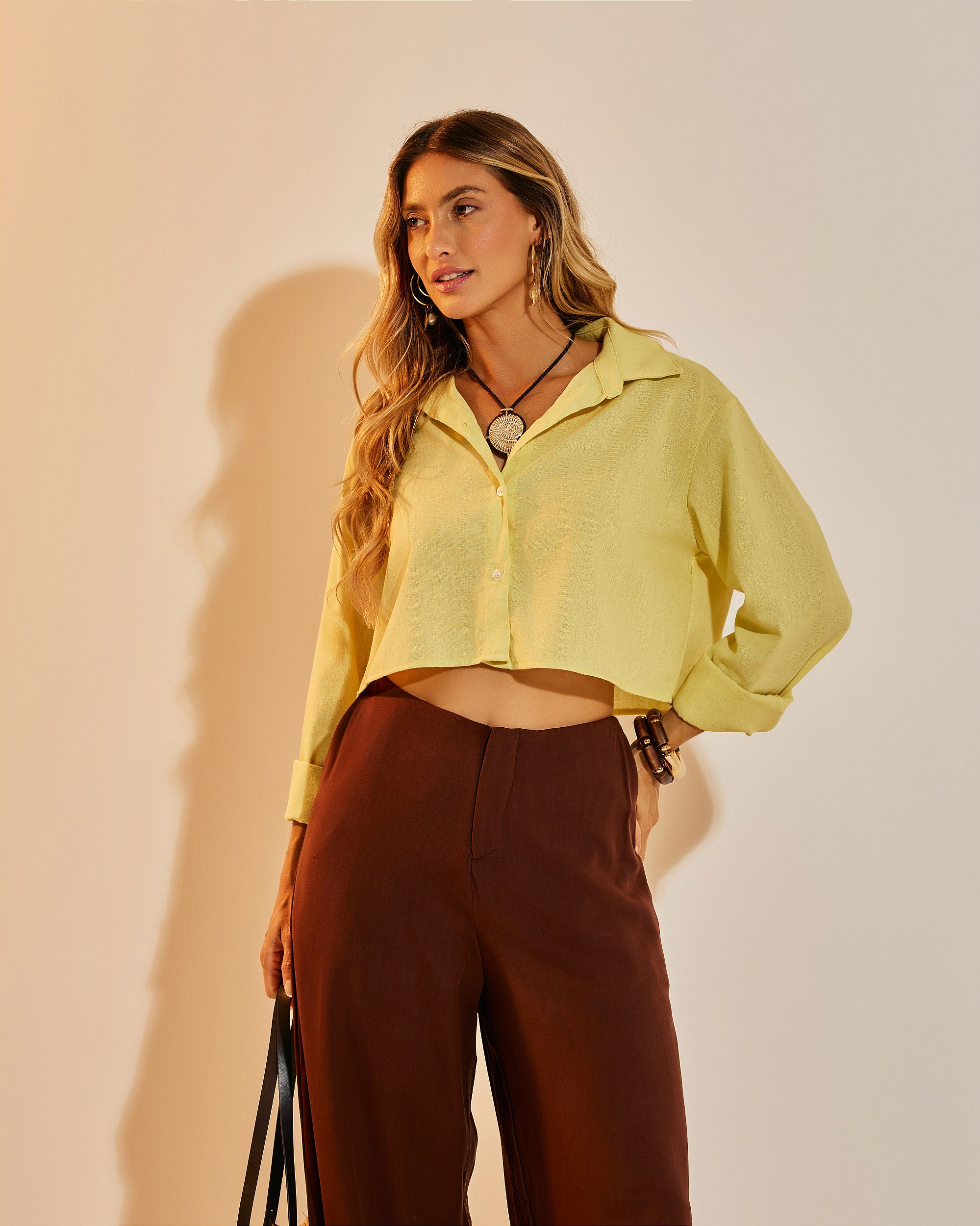 [detalhes] camisa cropped feita em linho com mangas longas. fecho frontal e no punho com botões.
