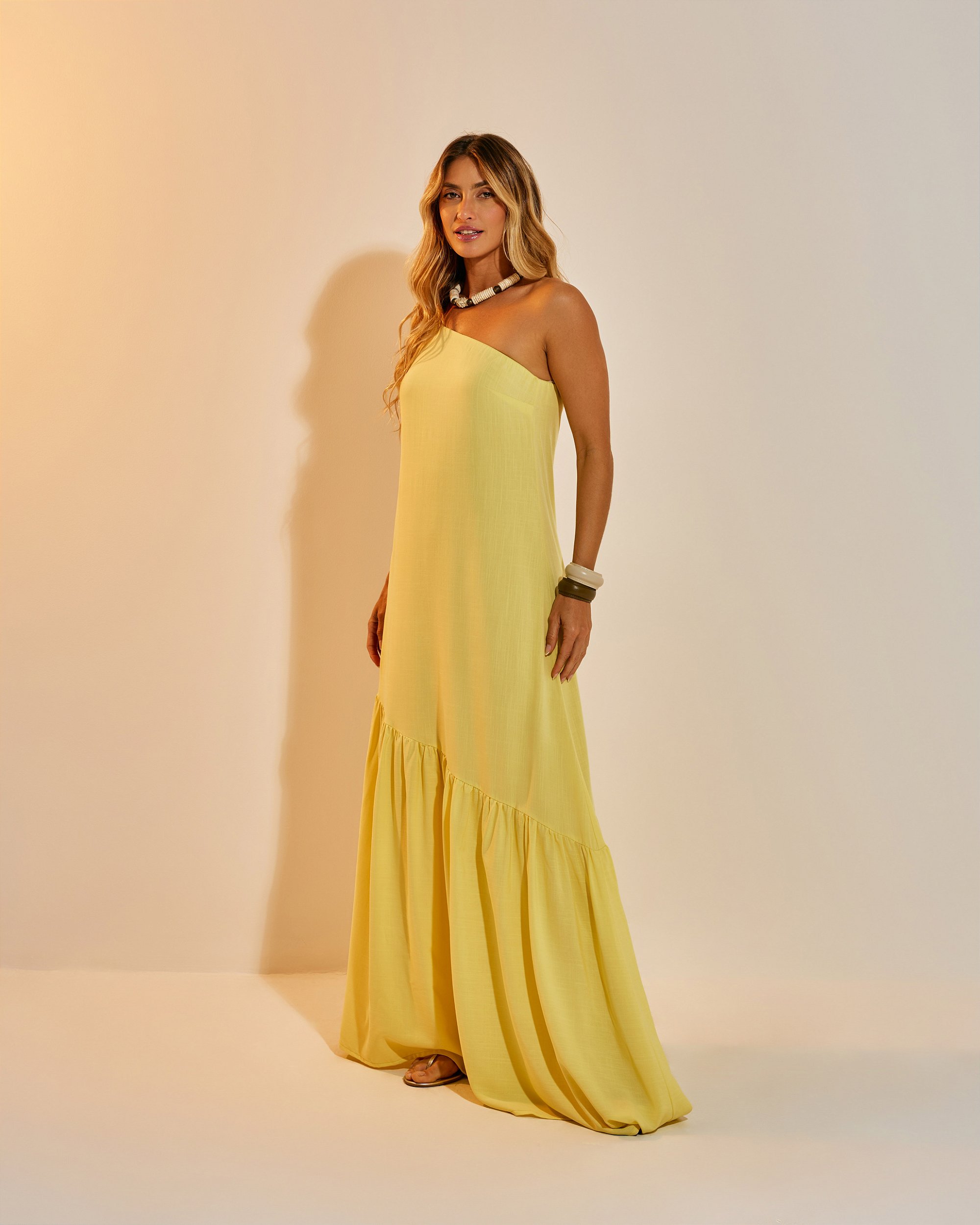 [detalhes] vestido longo amplo com uma alça regulável e barra com babado amplo assimétrico. possui forro