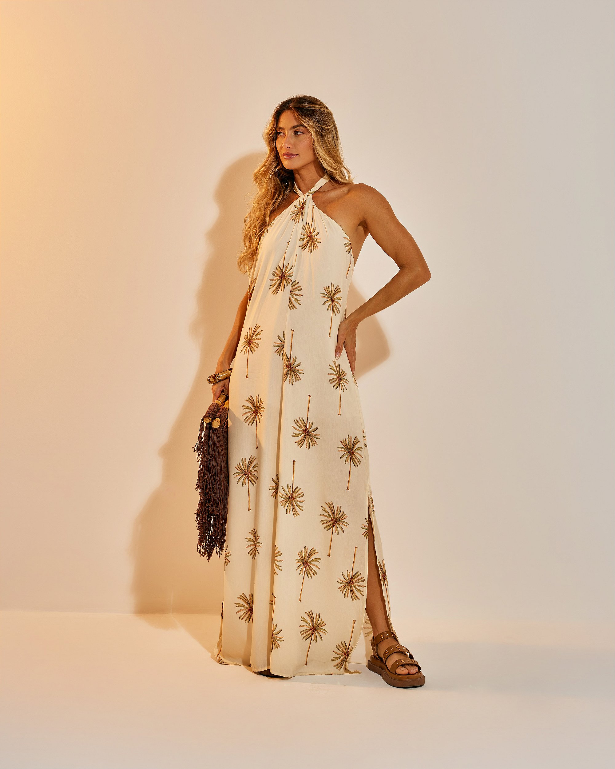 [detalhes] vestido longo frente única, com decote cruzado e amarração no pescoço. possui fendas laterais, fecho com zíper nas costas e forro